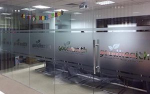 Decal mờ in logo dán kính văn phòng